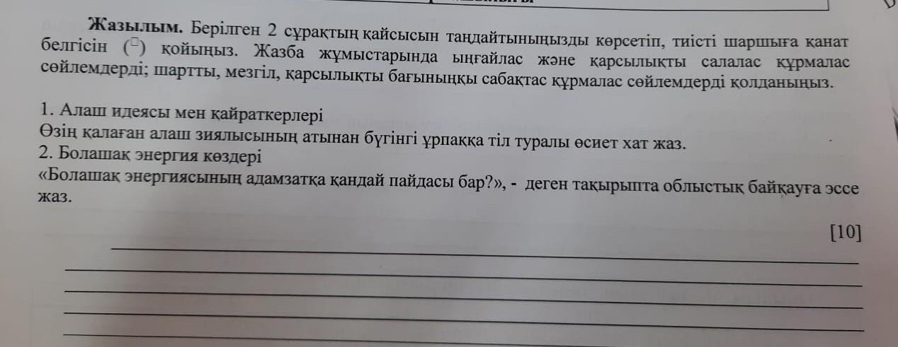 Жазылым. Берілген 2 сұрақтың қайсысын таңдайтыныңызды көрсетіп, тиісті шаршыға канат белгiсiн (-) койыныз. Жазба жұмыстарында ыңғайлас және құрмалас сөйлемдерді; шартты, мезгіл, қарсылықты бағыныңқы сабақтас құрмалас сөйлемдерді колданыңыз. карсылықты салалас 1. Алаш идеясы мен кайраткерлері Өзің қалаған алаш зиялысының атынан бүгінгі ұрпаққа тіл туралы өсиет хат жаз. 2. Болашак энергия көздері.