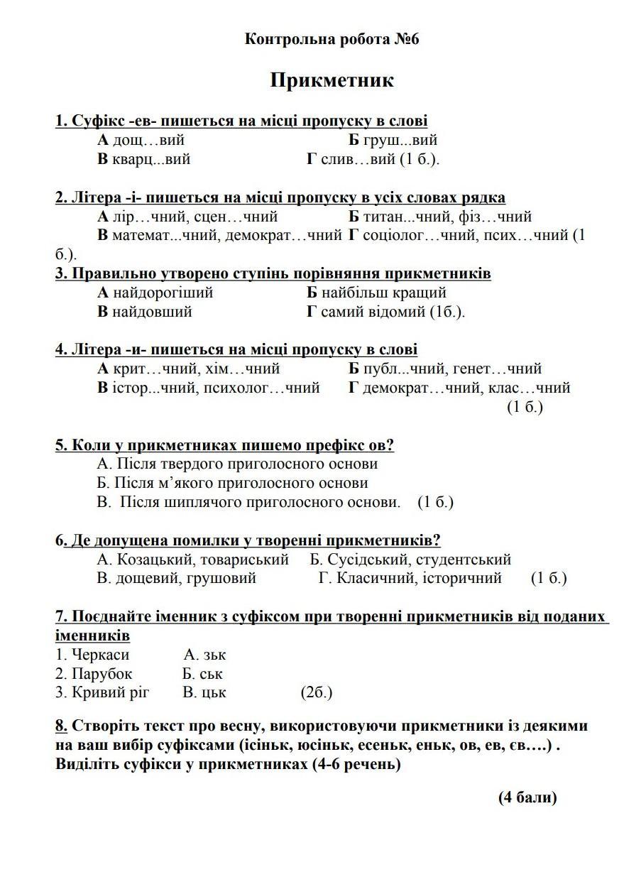 ПОМОГИТЕ ПОЖАЛУЙСТА ДАМ 100 БАЛЛОВ Контрольна робота №6 Прикметник 1. Суфікс -ев- пишеться на місці пропуску в слові А дощ...вий Б груш...вий В кварц...вий Г слив...вий (1 б.). 2. Літера -і- пишеться на місці пропуску в усіх словах рядка А лiр...чний, сцен... чний Б титан...чний, фіз. чний В математ...чний, демократ...чний Г соціолог...чний, псих...чний (1 б.). 3. Правильно утворено ступінь порівняння прикметників А найдорогіший В найдовший Б найбільш кращий Г самий відомий (16.). 4. Літера -и- пишеться на місці пропуску в слові А крит.чний, хім…чний В істор...чний, психолог...чний Б публ...чний, генет...чний Г демократ...чний, клас...чний (1 6.) 5. Коли у прикметниках пишемо префікс ов? А. Після твердого приголосного основи Б. Після м'якого приголосного основи В. Після шиплячого приголосного основи. (1 б.) А.ЗЬК Б.ськ В. Цьк 6. Де допущена помилки у творенні прикметників? А. Козацький, товариський Б. Сусідський, студентський В. дощевий, грушовий Г. Класичний, історичний (1 6.) 7. Поєднайте іменник з суфіксом при творенні прикметників від поданих іменників 1. Черкаси 2. Парубок 3. KpubИЙ pir (26.) 8. Створіть текст про весну, використовуючи прикметники із деякими на ваш вибір суфіксами (ісіньк, юсіньк, есеньк, еньк, ов, ев, єв....) . Виділіть суфікси у прикметниках (4-6 речень) (4 бали)