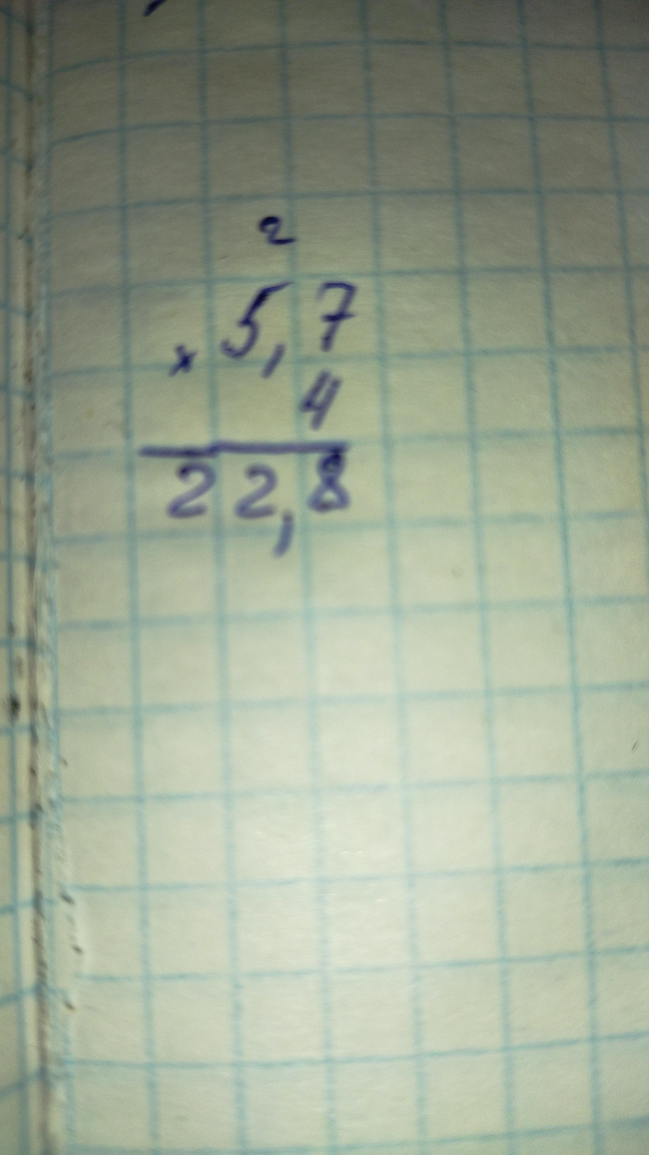 Что бы умножить 5,7 на 4 в столбик, сначала правильно пишем дробное и целое число. Далее умножаем 7*4 = 28, но 8 пишем а 2 запоминаем. Дальше 5*4 = 20, и добавляем двойку которую мы должны были запомнить 20+2 = 22.