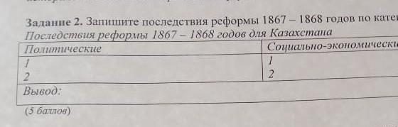 запишите последсвия реформы 1867-1668г. по категориям: последсвия реформ 1867-1868г для Казахстана. политические (2) социально-экономические.