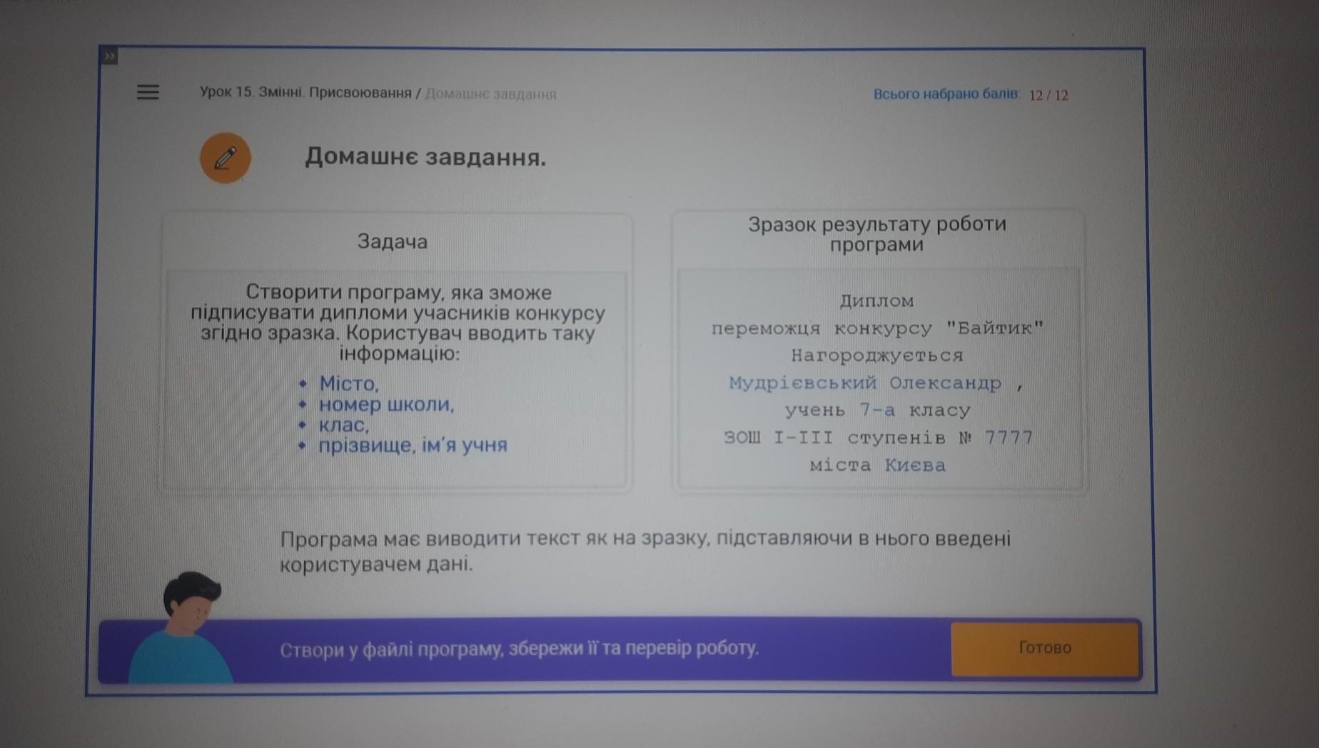 Програма має виводити текст як на зразку, підставляючи в нього введені користувачем дані.