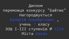 Створити програму у python, яка зможе підписувати дипломи учасників конкурсу згідно зразка. Користувач вводить таку інформацію
