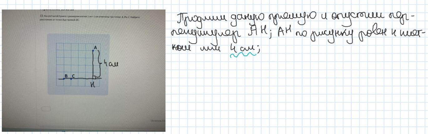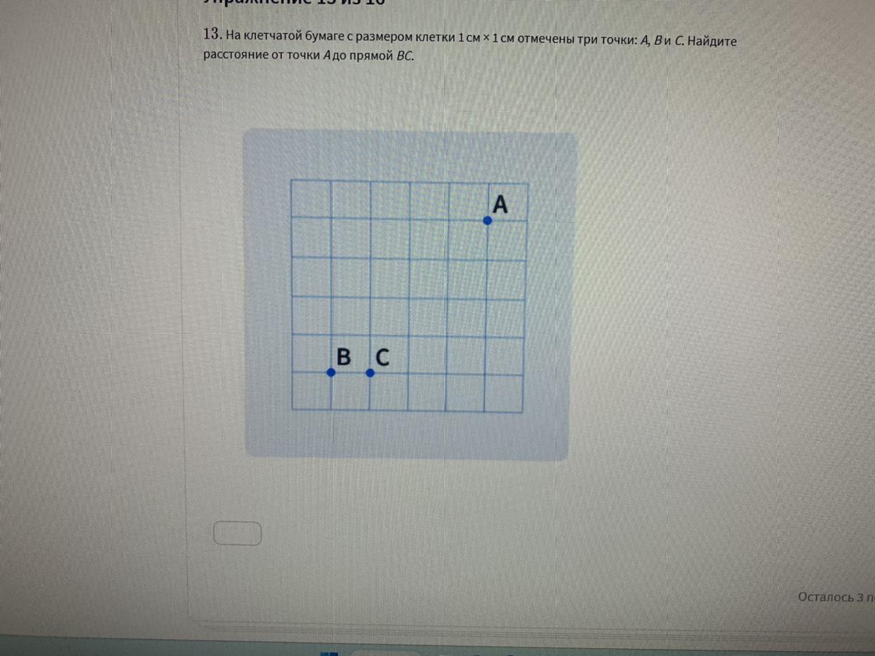 На клетчатой бумаге с размером клетки 1 см х 1 см отмечены три точки: А, В и С. Найдите расстояние от точки Адо прямой ВС.