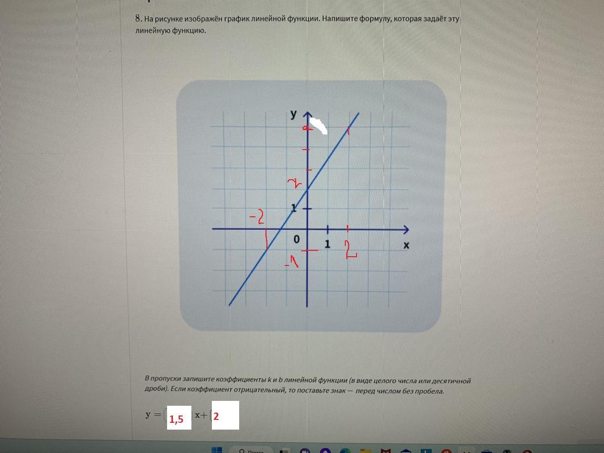 В пропуски запишите коэффициенты к и в линейной функции (в виде целого числа или десятичной дроби). Если коэффициент отрицательный, то поставьте знак - перед числом без пробела.