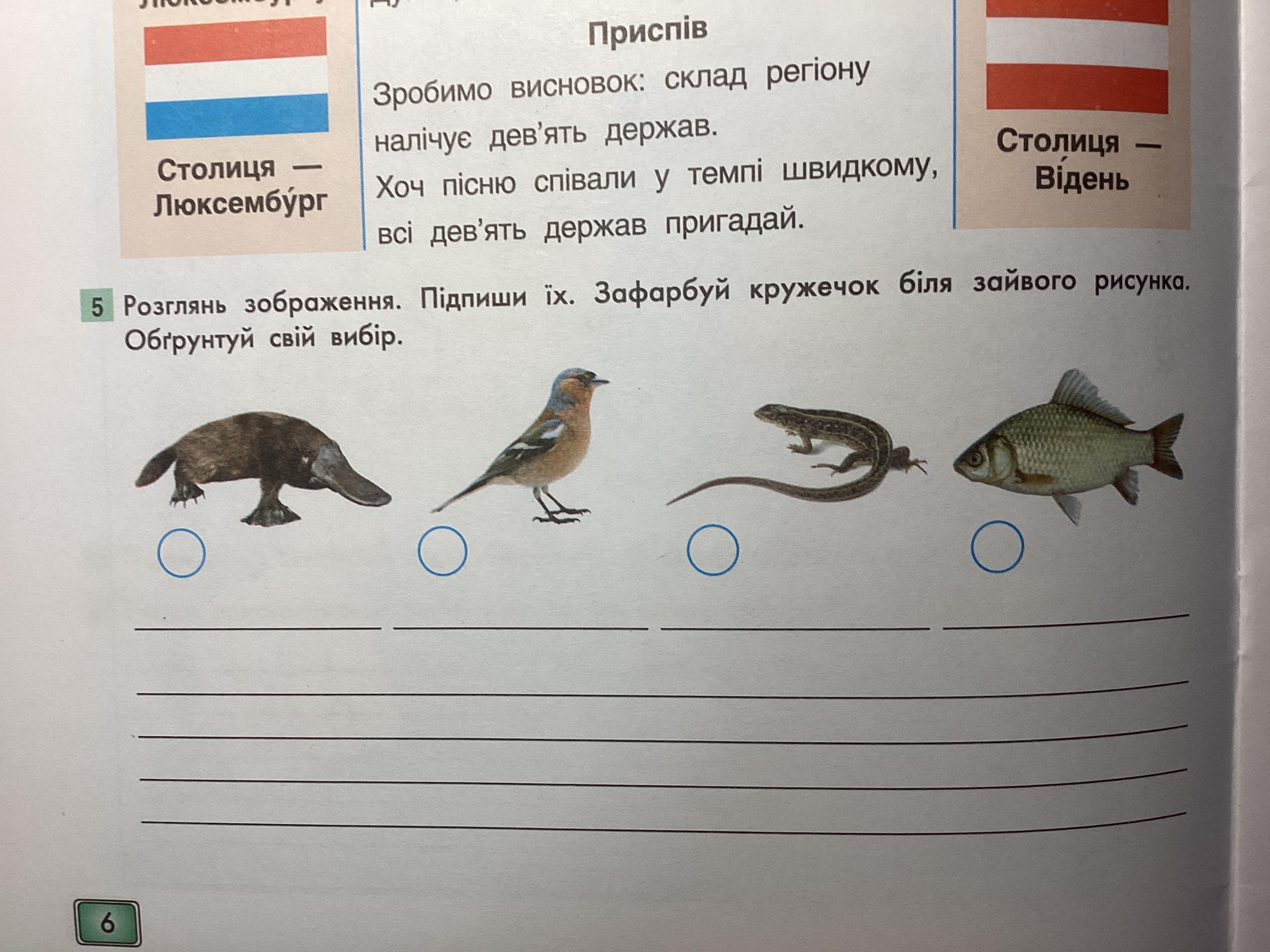 1-Качкодзьоб,2-зяблик(птах),3-ящірка,4-риба