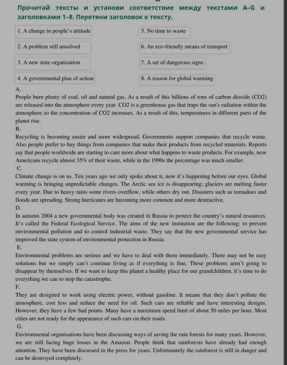 В тексте "G" говорится о природных проблемах и подходят заголовки "2" и "7"