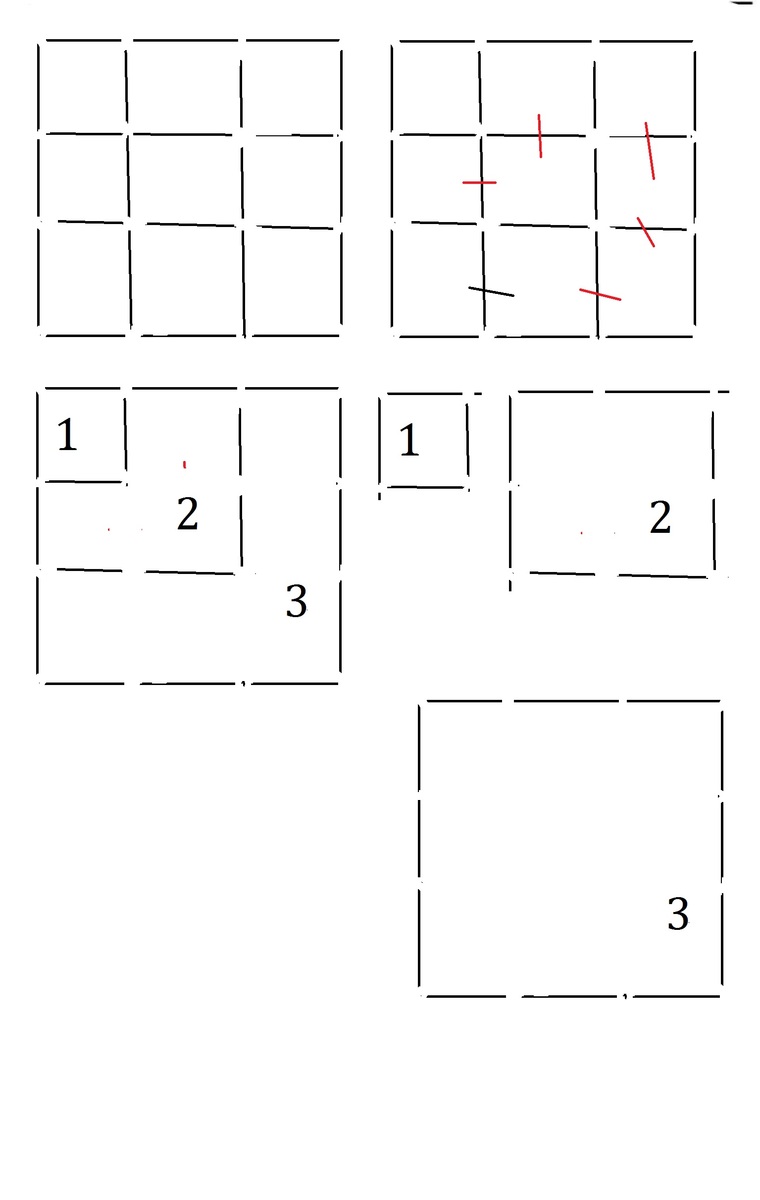 На рисунке ВНИЗУ изображена фигура, составленная из спичек. Убери из неё 6 спичек, не перекладывая остальных, чтобы осталось всего 3 квадрата. Я не могу сфотографировать.Что тут непонятного??????????????????