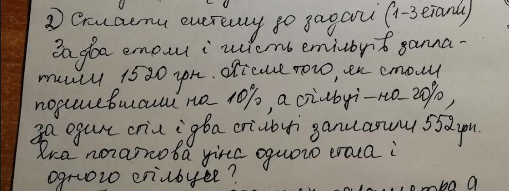пусть цена стола х грн., а стула у грн. тогда за два стола и 6 стульев заплатили 2х+6у, по условию это 1520. отсюда первое уравнение системы