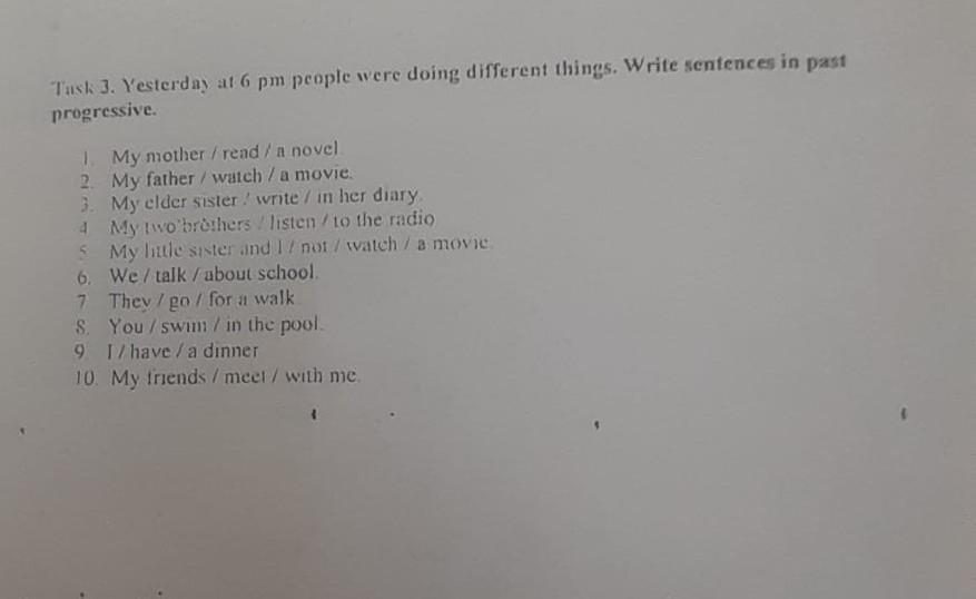 Task 3. Yesterday at 6 pm people were doing different things. Write sentences in past progressive.