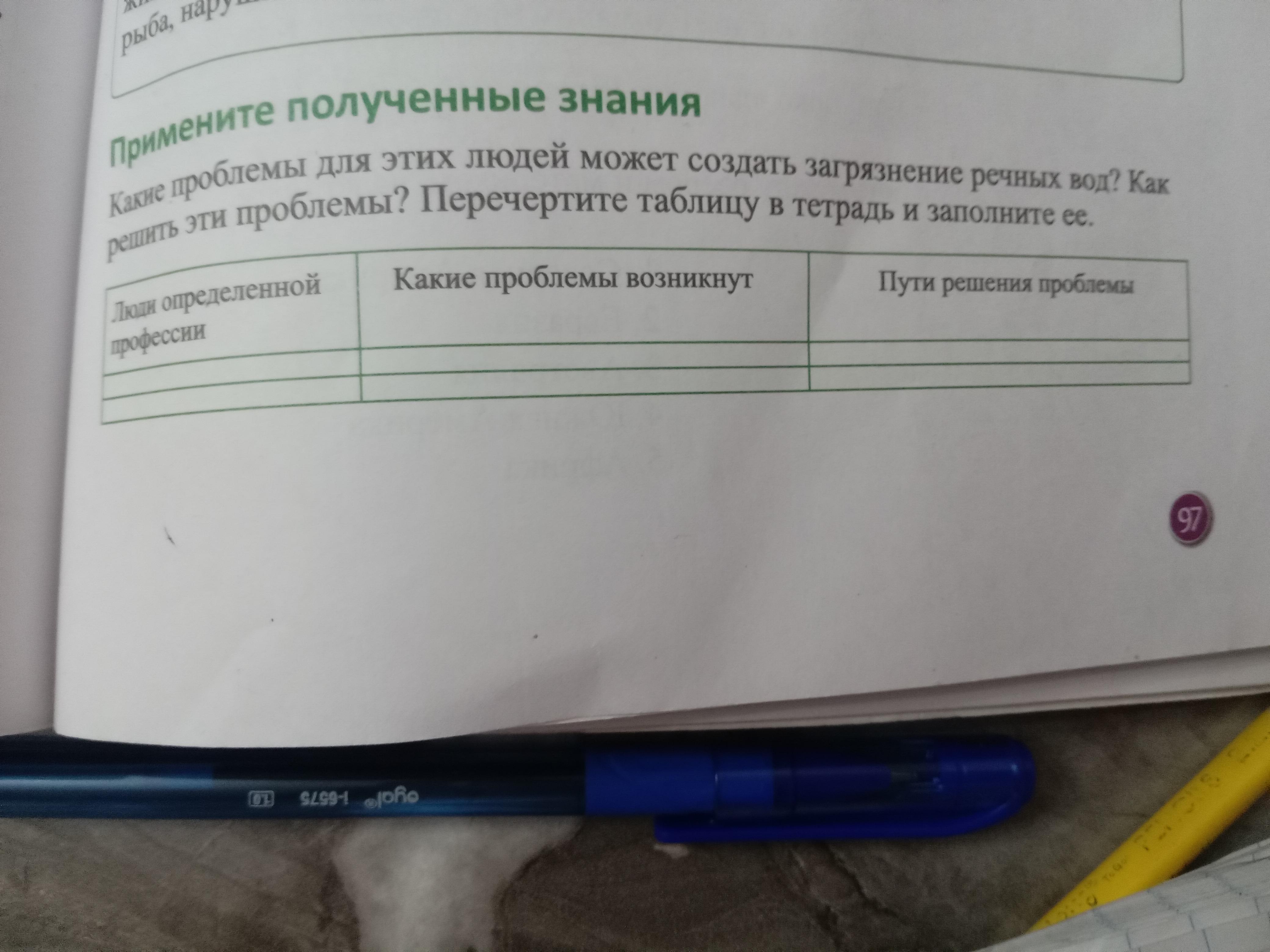 Какие проблемы для этих людей может создать загрязнение речных вод? Как решить эти проблемы? Перечертите таблицу в тетрадь и заполните её.
