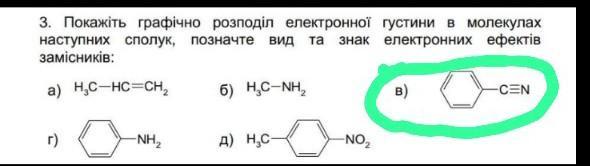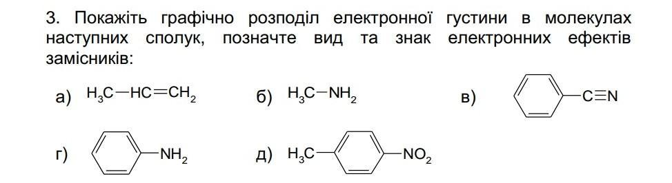 Покажіть графічно розподіл електронної густини в молекулах наступних сполук, позначте вид та знак електронних ефектів замісників: