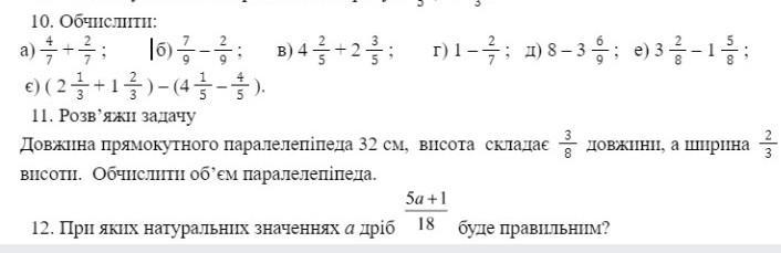 10. Обчислити: a) 7+7; (6)7-3; в) 43+23; в) 43+23; г)1-7 €) (23+13)-(435). 11. Розв'яжи задачу Довжина прямокутного паралелепіпеда 32 см, висота складає 3 довжини, а ширина висоти. Обчислити об'єм паралелепіпеда. г) 1-7; д) 8-35; 0) 32-13; е) 5a+1 12. При яких натуральних значеннях а дріб 18 буде правильним?