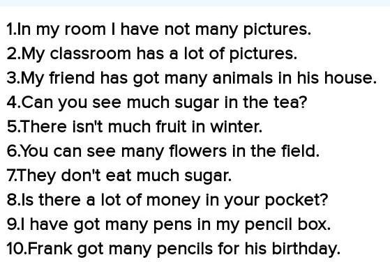 Вставьте нужное пропущенное слово much many a lot of . In my room I have not pictures. In my classroom we have pictures. My friend has got Can you see There isn't 1. 2. 3. 4. 5. 6. You can see 7. They don't eat 8. 9. 10. toys Is there I have got Frank got pencils. animals in the zoo? sugar in the tea. flowers in the field. fruit in winter. money in your pocket? pens in my pencil box. toys for his birthday nouus rдOHKU