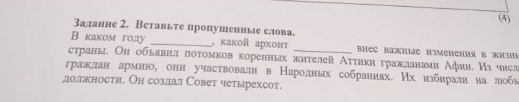 Задание 2. Вставьте пропущенные слова. В каком году какой архонт внес важные изменения в жизнь страны. Он обьявил потомков коренных жителей АТТИКИ гражданами Афин. Из числ граждан армию, они участвовали в Народных собраниях. Их избирали на любь- должности. Он создал Совет четырехсот.