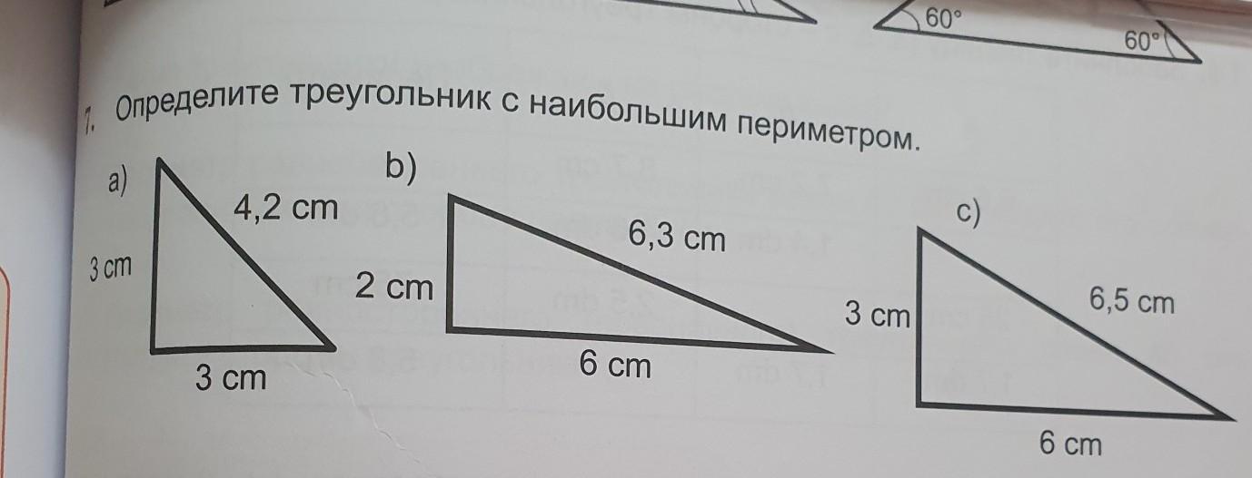 17. Определите треугольник с наибольшим периметром. b) a) 3 cm 4,2 cm 3 cm 2 cm 6,3 cm 6 cm 3 cm 6,5 cm 6 cm