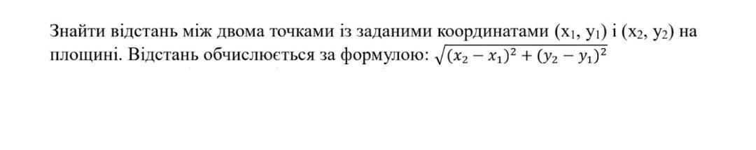 Знайти відстань між двома точками із заданими координатами (x1, y1) i (x2, y2) на площині. Відстань обчислюється за формулою: √(x2 — X1)2 + (У2 — У1)2