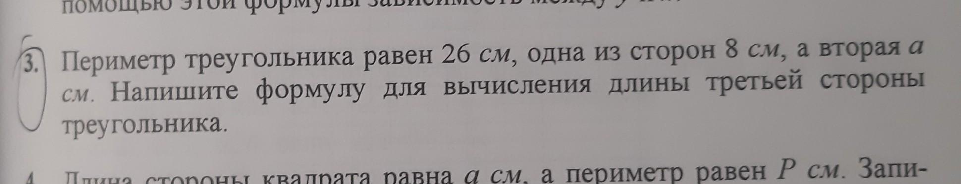 3. Периметр треугольника равен 26 см, одна из сторон 8 см, а вторая а см. Напишите формулу для вычисления длины третьей стороны треугольника.