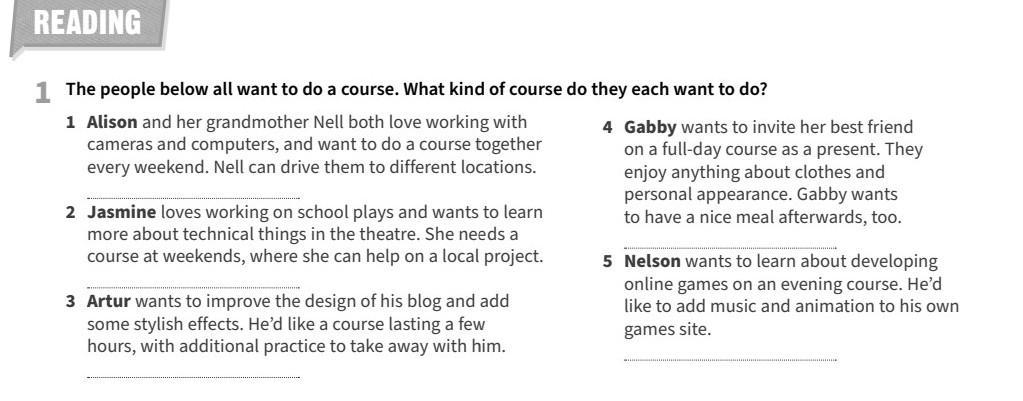The people below all want to do a course. What kind of course do they each want to do? 1 Alison and her grandmother Nell both love working with cameras and computers, and want to do a course together every weekend. Nell can drive them to different locations. 2 Jasmine loves working on school plays and wants to learn more about technical things in the theatre. She needs a course at weekends, where she can help on a local project. 3 Artur wants to improve the design of his blog and add some stylish effects. He'd like a course lasting a few hours, with additional practice to take away with him. 4 Gabby wants to invite her best friend on a full-day course as a present. They enjoy anything about clothes and personal appearance. Gabby wants to have a nice meal afterwards, too. 5 Nelson wants to learn about developing online games on an evening course. He'd like to add music and animation to his ov games site.