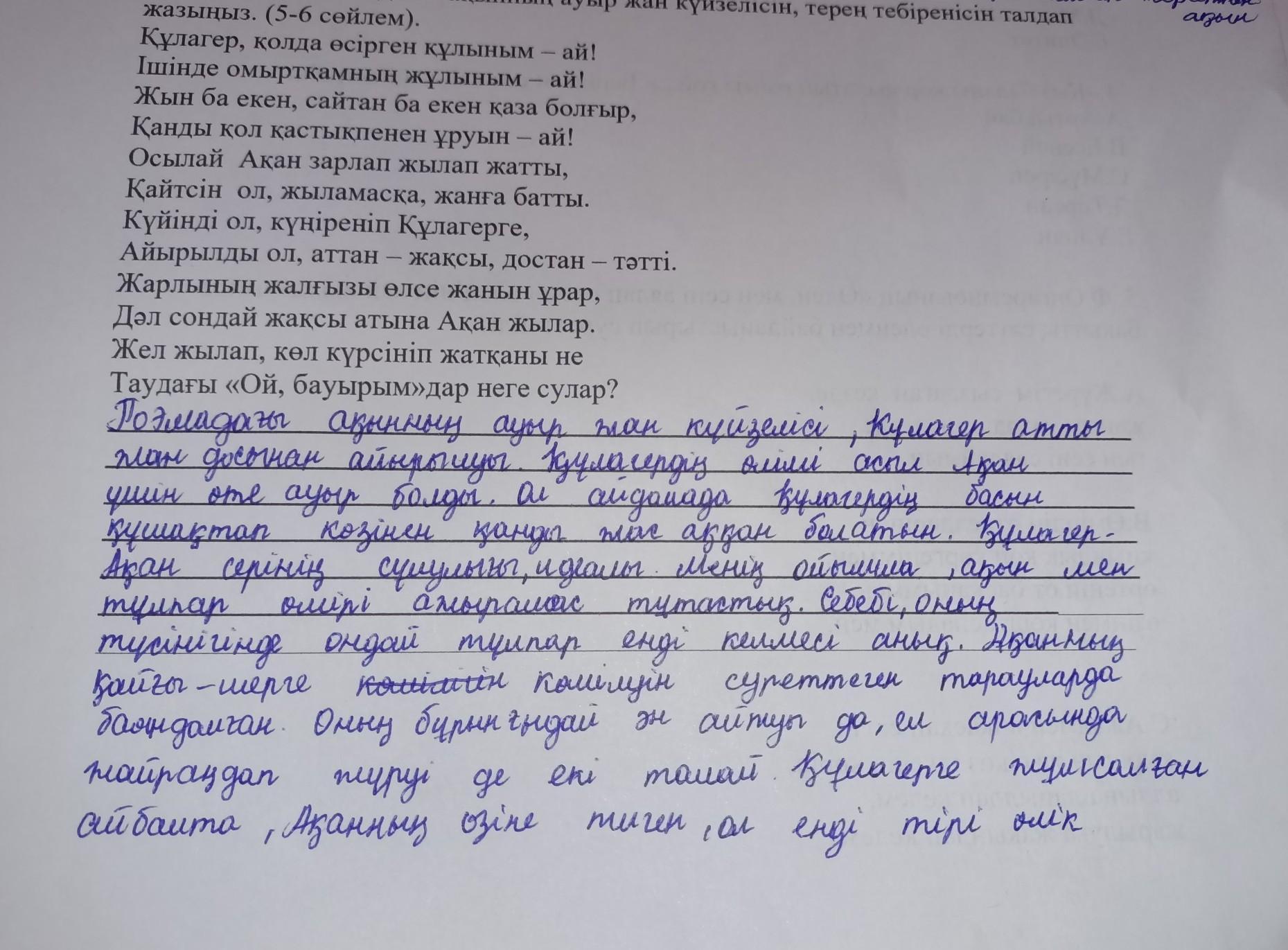 7.Тапсырма. Поэмадагы акыннын ауыр жан күйзелiсiн, терең тебіренiсiн талдап жазыныв. (5-6 сейлем). Құлагер, қолда өсiрген құлыным-ай! Ішiнде омыртқамнын жулыным-ай! Жын ба екен, сайтан ба екен қаза болғыр, Қанды қол қастықпенен ұруын - ай! Осылай Ақан зарлап жылап жатты, Кайтсiн ол, жыламаска, жанға батты. Күйiндi ол, күңіреніп Құлагерге, Айырылды ол, аттан-жаксы, достан-тәтті. Жарлынын жалгывы өлсе жанын урар, Дал сондай жақсы атына Ақан жылар. Жел жылап, кол курсiнiп жатканы не Таудағы «Ой, бауырым дар неге сулар?