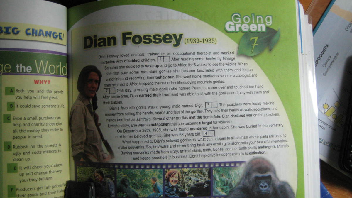 Диджит. Браконьеры были местными жителями, которые зарабатывали деньги на продаже рук, голов и ног горилл. Они продавали их головы в качестве украшения для стен, а руки и ноги, как пепельницы. Несколько других горилл постигла та же участь. Диан объявила войну браконьерам. К сожалению, она была настолько откровенна, что она стала мишенью для насилия.
