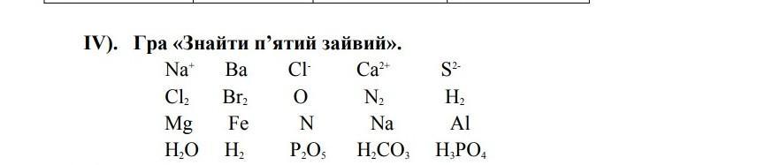 IV). Гра «Знайти п'ятий зайвий». Nat Ba CI- Ca²+ Cl₂ Br₂ O Mg Fe N Na H₂O H₂ P₂O₁ H₂CO3 N₂ S²- H₂ Al H₂PO4