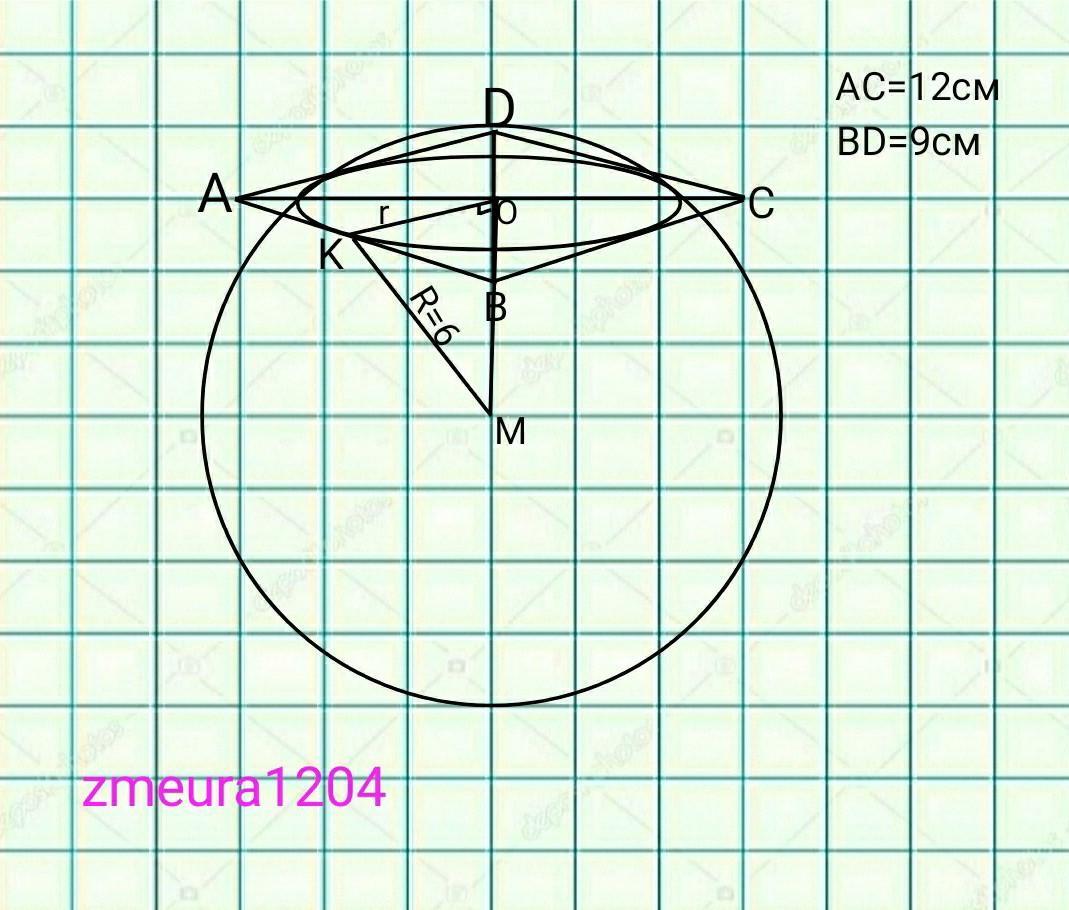 ОМ=√(КМ²-КО²)=√(R²-r²)=√(6²-3,6²)=