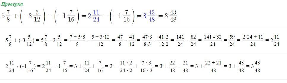 5 7/8+(-3 5/12)-(-1 7/16) = 5 21/24 - 3 10/24 + 1 7/16 = 2 11/24 + 1 7/16 =