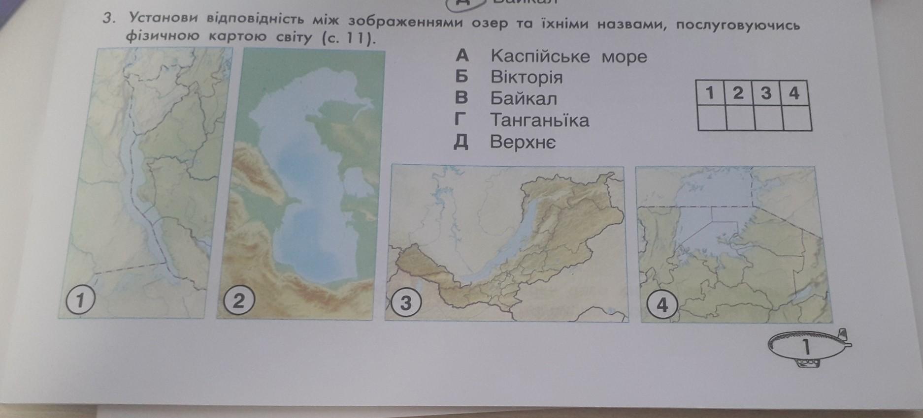 3. Установи вiдповiднiсть мiж зображеннями озер та їхніми назвами, послуговуючись фізичною картою світу (с. 11). 2 3 A Каспійське море Б Вiкторiя В Байкал г Танганьїка д верхне