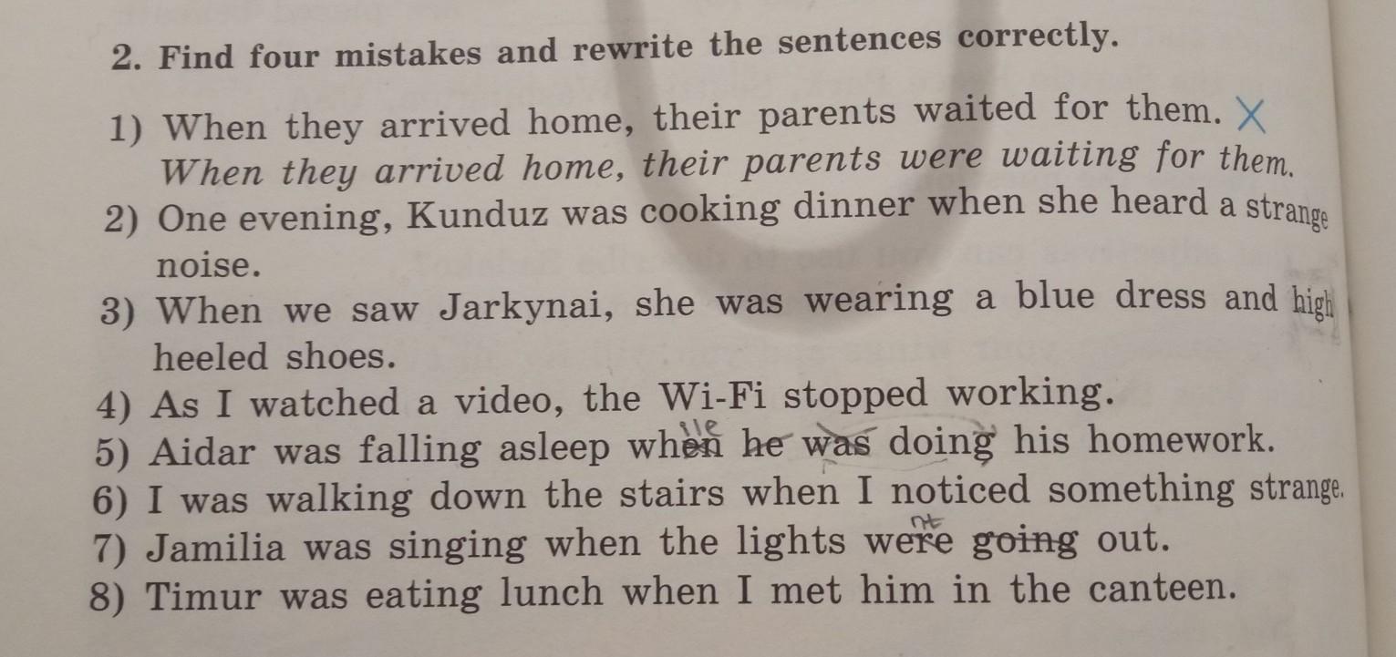 2. Find four mistakes and rewrite the sentences correctly. 1) When they arrived home, their parents waited for them. X When they arrived home, their parents were waiting for them. 2) One evening, Kunduz was cooking dinner when she heard a strange noise. 3) When we saw Jarkynai, she was wearing a blue dress and high heeled shoes. 4) As I watched a video, the Wi-Fi stopped working. 5) Aidar was falling asleep when he was doing his homework. 6) I was walking down the stairs when I noticed something strange. 7) Jamilia was singing when the lights were going out. 8) Timur was eating lunch when I met him in the canteen.
