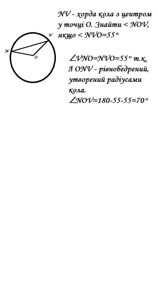 NV - хорда кола з центром у точці О. Знайти < NOV, якщо < NVO=55°