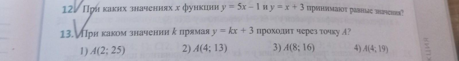 подставляем координаты точки: -2k-3=9; -2k=9+3; -2k=12; k=12:(-2)= -6. Ответ: k= -6. 12. у=kx+3, A(4;11). Подставим: