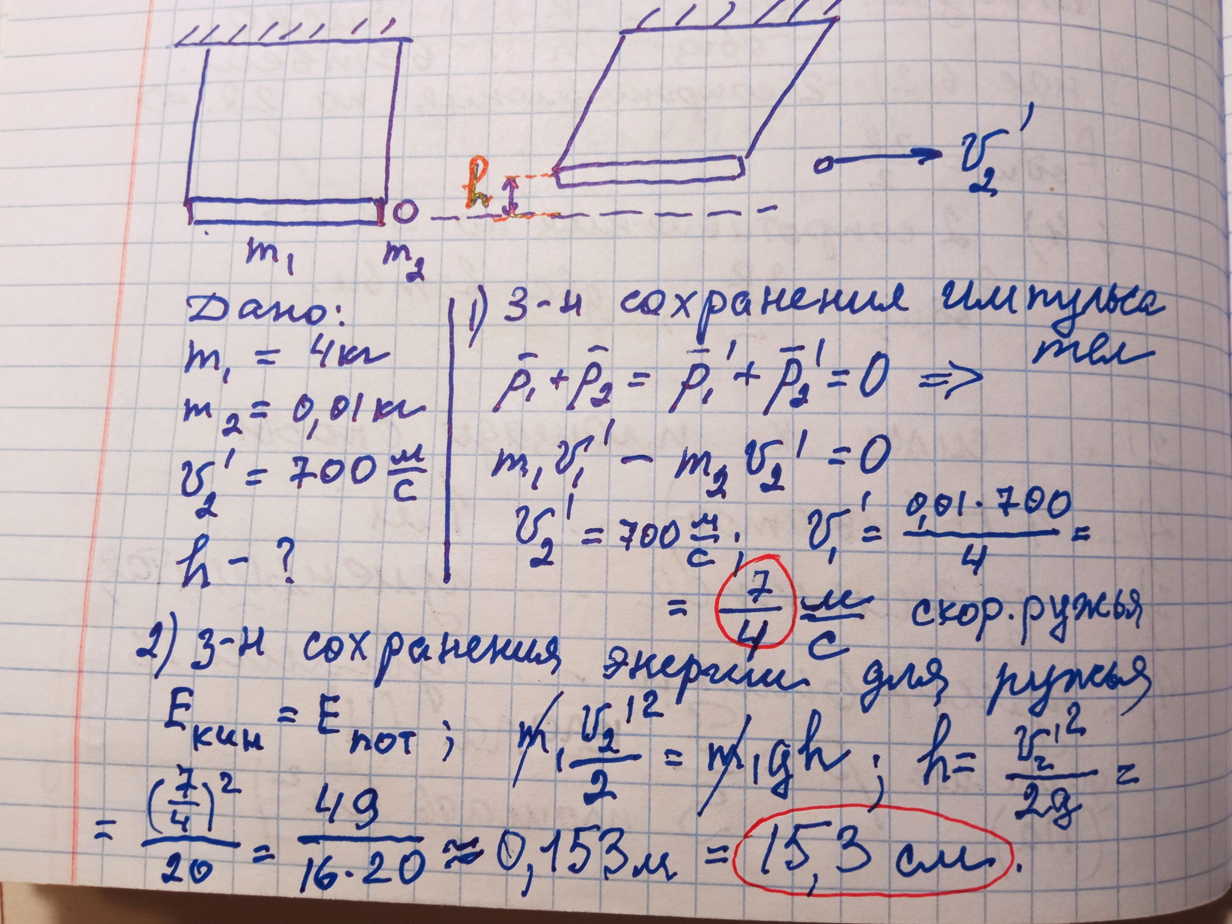 Из ружья массой 4 кг вылетает пуля массой 10 г со скоростью 700 м/с. На какую высоту поднимается ружье после выстрела, если оно подвешено горизонтально на нитях?