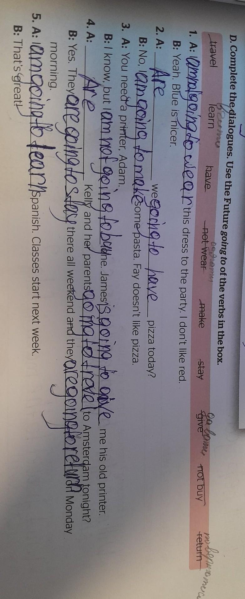 1.am not going to wear 2.Are...going to have 3. am going to make 4.am not going to buy 5. is going to give 6.Are...going to trevel 7.are going to stay 8. are going to return 9.am going to learn