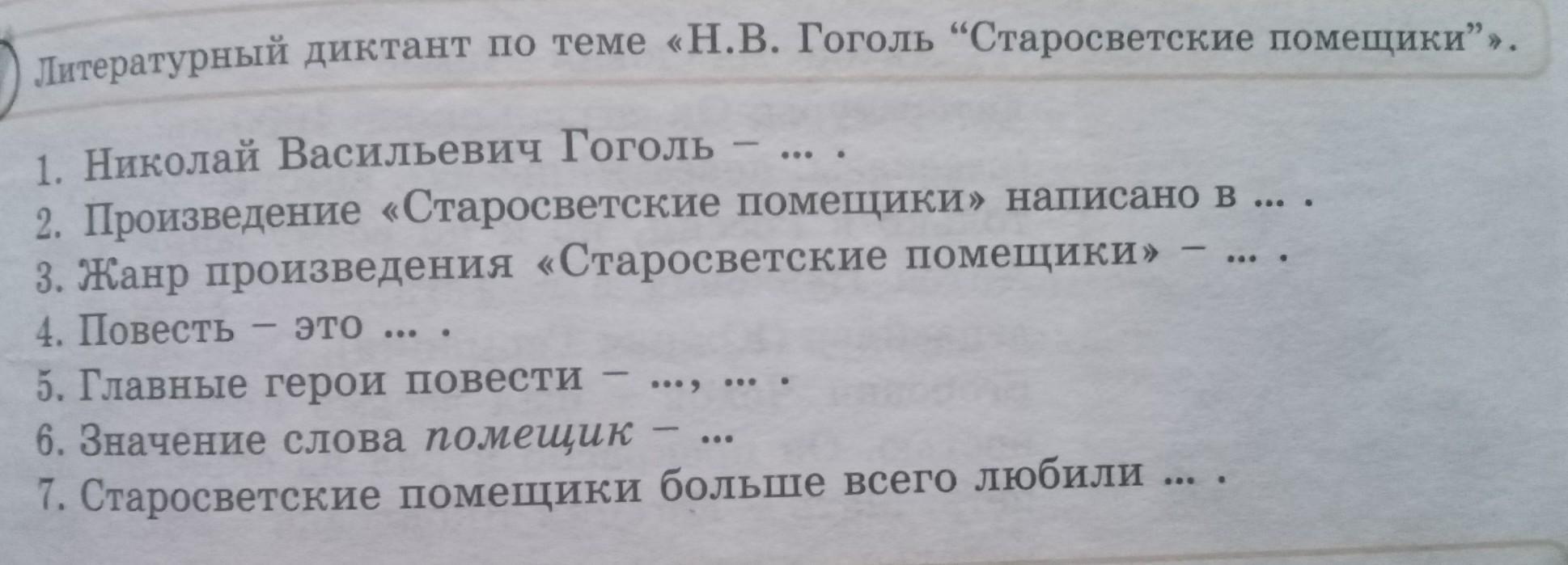 Литературный диктант по теме «Н.В. Гоголь "Старосветские помещики"»