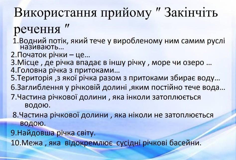 Помогите ПЖ срочно дам 100 баллов Використання прийому " Закінчіть речення 1.Водний потік, який тече у виробленому ним самим руслі називають... 2.Початок річки – це... - ... 3.Місце, де річка впадає в іншу річку , море чи озеро . 4.Головна річка з притоками... 5.Територія ,з якої річка разом з притоками збирає воду... 6.Заглиблення у річковій долині,яким постійно тече вода... 7.Частина річкової долини, яка інколи затоплюється водою. 8.Частина річкової долини, яка ніколи не затоплюється водою. 9.Найдовша річка світу. 10.Межа, яка відокремлює сусідні річкові басейни.