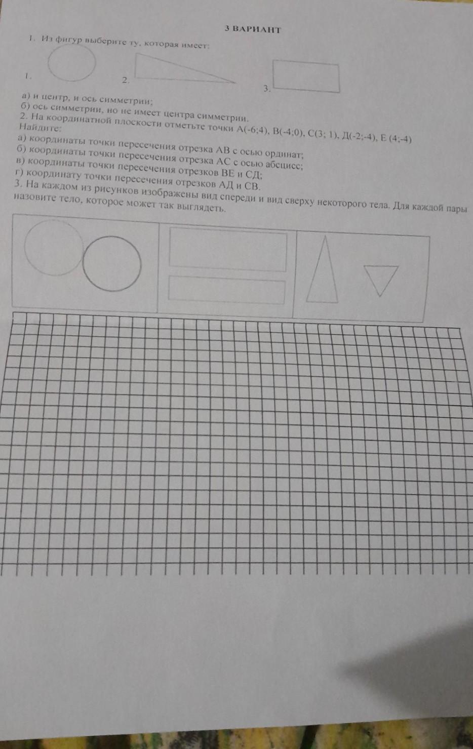 1. Из фигур выберите ту, которая имеет: 3 ВАРИАНТ 1. а) и центр, и ось симметрии: б) ось симметрии, но не имеет центра симметрии. 2. На координатной плоскости отметьте точки А(-6;4), B(-4;0), C(3; 1), Д(-2;-4), Е (4;-4) Найдите: 2. 3. а) координаты точки пересечения отрезка АВ с осью ординат, б) координаты точки пересечения отрезка АС с осью абсцисс: в) координаты точки пересечения отрезков ВЕ и СД; г) координату точки пересечения отрезков АД и СВ. 3. На каждом из рисунков изображены вид спереди и вид сверху некоторого тела. Для каждой пары назовите тело, которое может так выглядеть. дам 20 баллов СРОЧНО