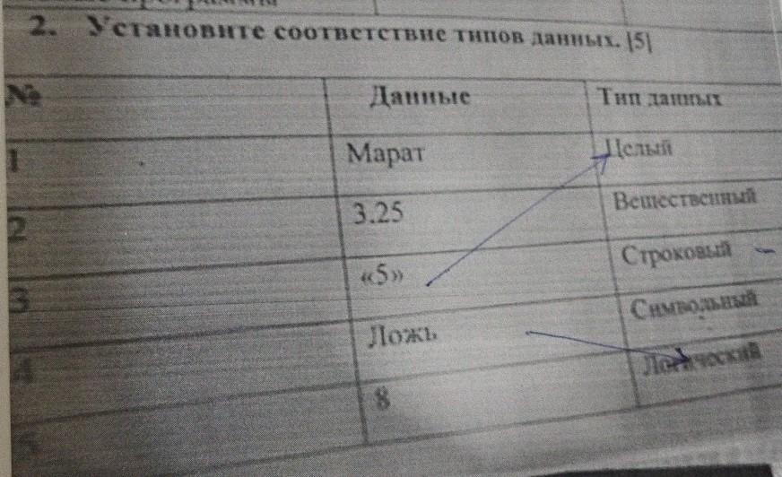 (1) WhatsApp программы 2. Установите соответствие типов данных. [5] Данные Марат 3.25 «5» Ложь 3 Тип данных Целый Вешественный Строковый Символьный Joch social Rou