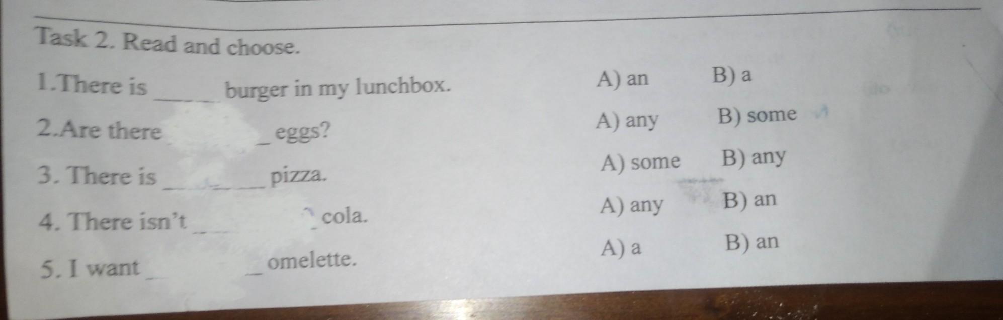 СРОЧНО Read and choose there is_____burger in my lunchbox. are there______eggs? there is_____pizza There isn't_____cola