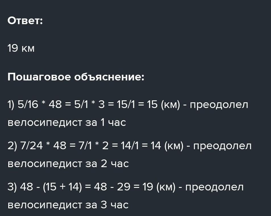 вилосипидист за 3 години подолав 48 км. За першу годину він подолав 5/16,а за другу - 7/24 усієї відстані. Скульки кілометрів подолав велосипедист за третю годину?