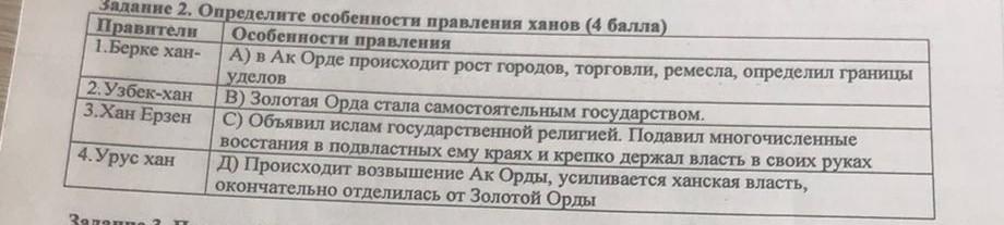 Задание 2. Определите особенности правления ханов (4 балла) Правителн Особенности правления 1.Берке хан- 2. Узбек-хан 3.Хан Ерзен 4. Урус хан Залапна ? П А) в Ак Орде происходит рост городов, торговли, ремесла, определил границы уделов В) Золотая Орда стала самостоятельным государством. С) Объявил ислам государственной религией. Подавил многочисленные восстания в подвластных ему краях и крепко держал власть в своих руках Д) Происходит возвышение Ак Орды, усиливается ханская власть, окончательно отделилась от Золотой Орды