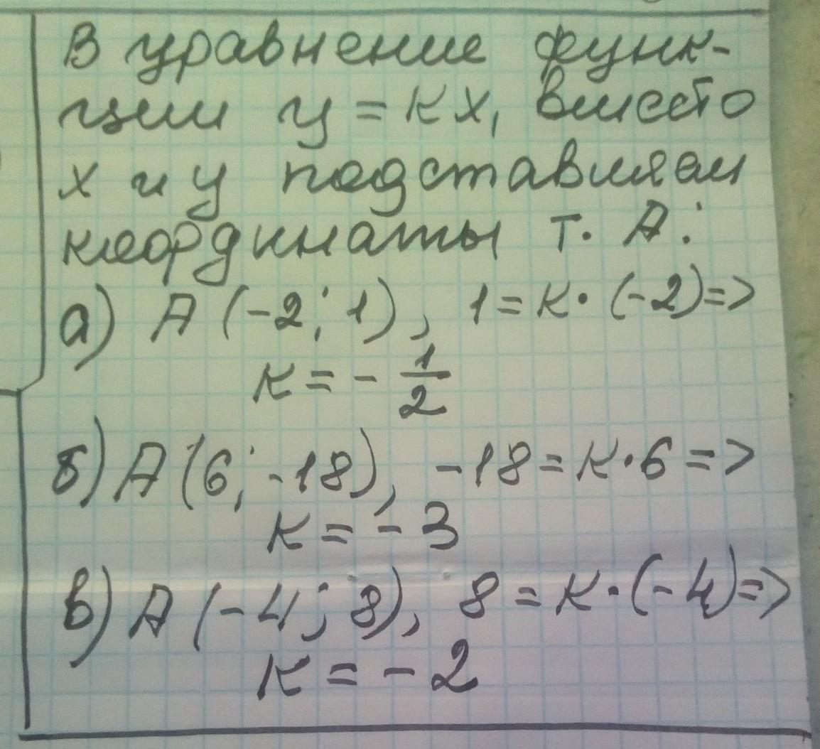 2. Если известно, что точка А лежит на графике функции у = kx, найдите значение к a) A(-2; 1) b) A(6; -18) c) A(-4; 8)