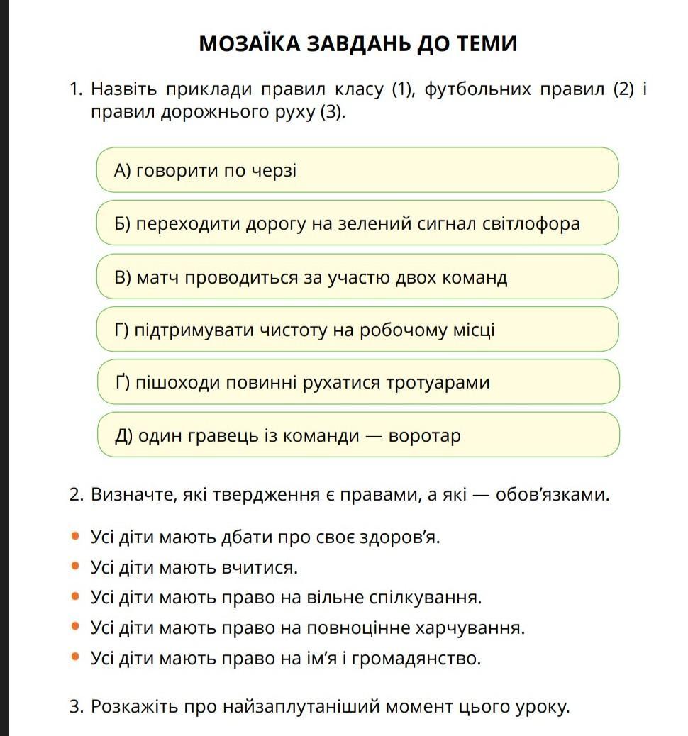 МОЗАЇКА ЗАВДАНЬ ДО ТЕМИ 1. Назвіть приклади правил класу (1), футбольних правил (2) і правил дорожнього руху (3). А) говорити по черзі Б) переходити дорогу на зелений сигнал світлофора В) матч проводиться за участю двох команд Г) підтримувати чистоту на робочому місці Ґ) пішоходи повинні рухатися тротуарами Д) один гравець із команди воротар