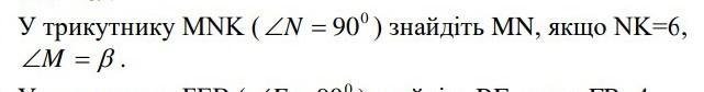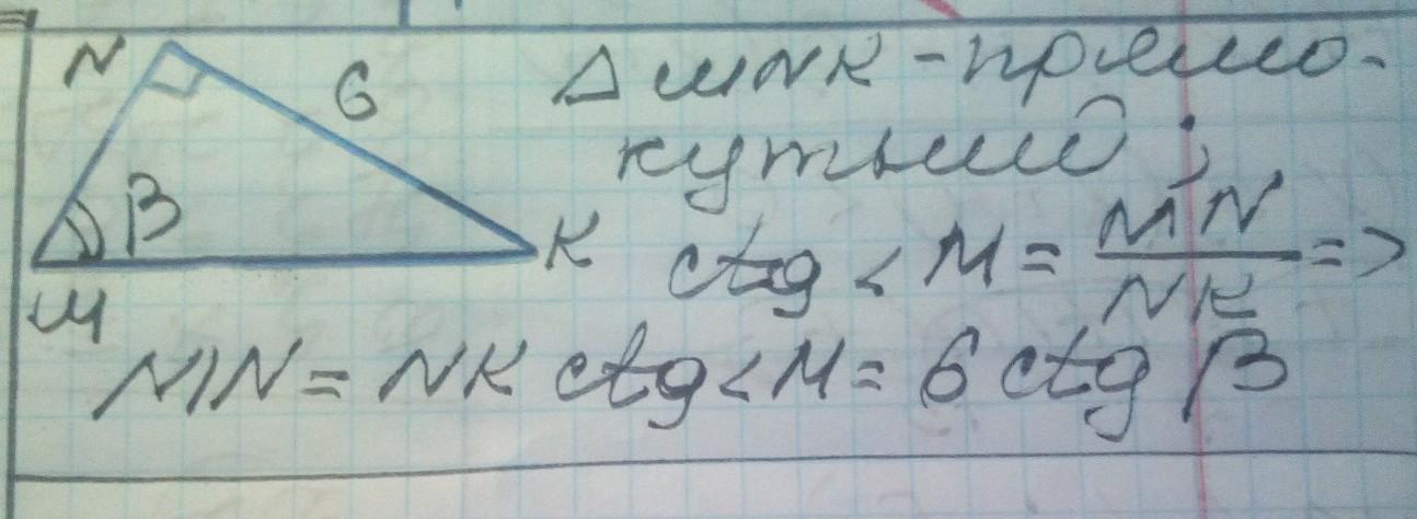 у трикутнику MNK ( <N = 90º ) знайдіть MN, якщо NK=6, <M = B .