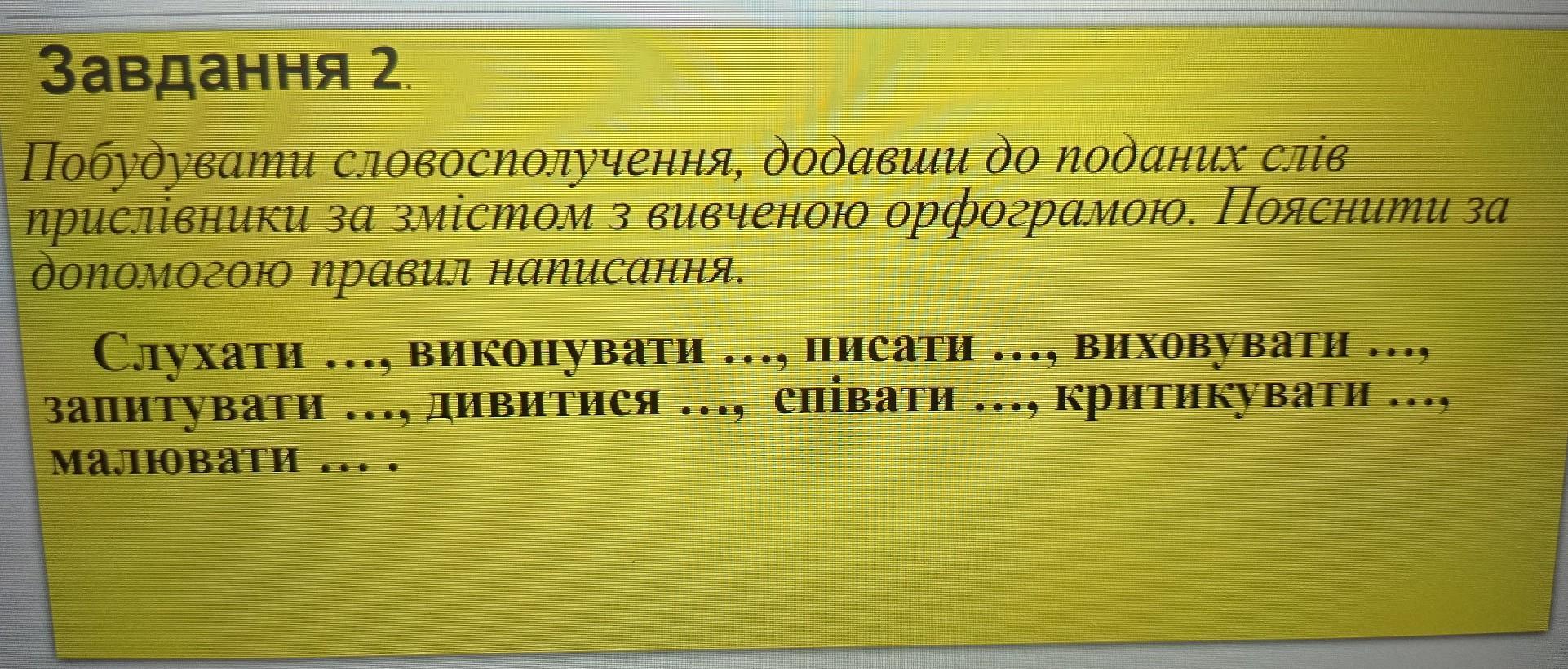 Слухати уважно, виконувати швидко, писати ретельно, виховувати дбайливо, запитувати обачливо, дивитися уважно, співати гучно, критикувати об'єктивно, малювати творчо.