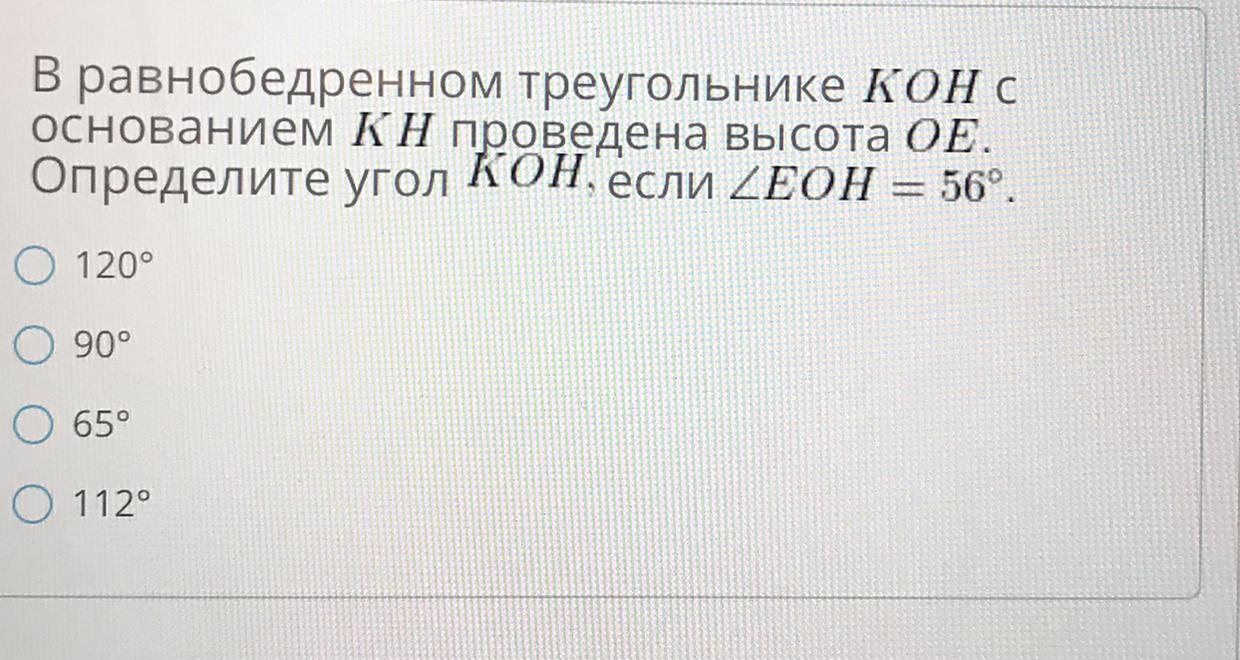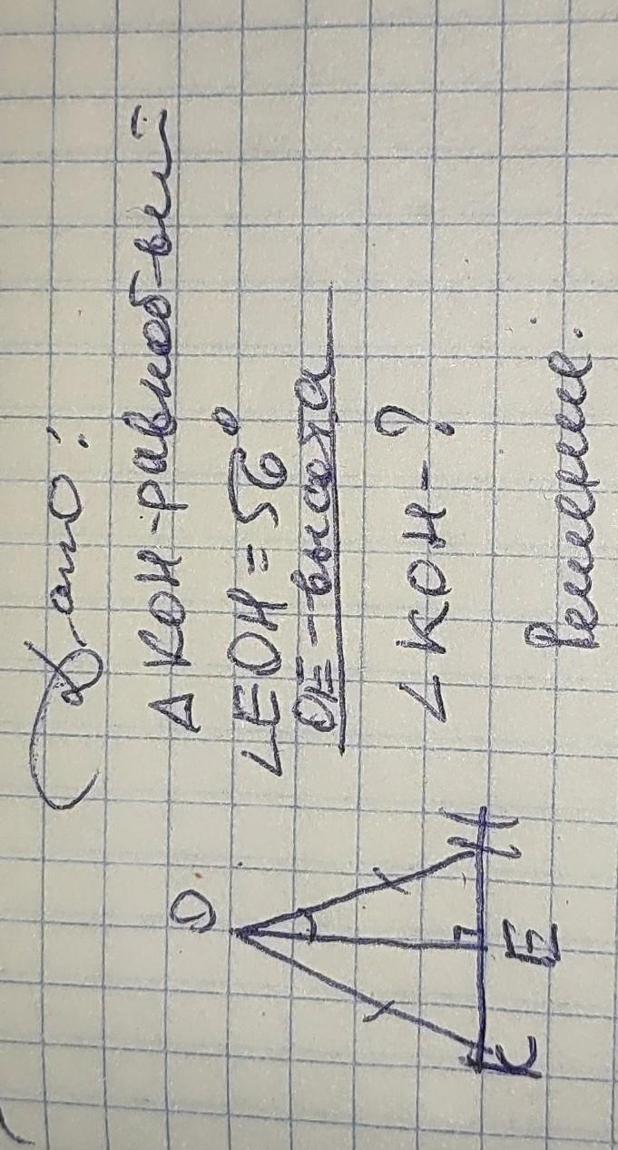 В равнобедренном треугольнике высота,проведённая к основанию,является и медианой,и биссектрисой,значит <КОЕ=<ЕОН=56°