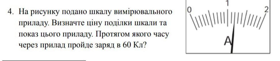 На рисунку подано шкалу вимірювального приладу. Визначте ціну поділки шкали та показ цього приладу. Протягом якого часу через прилад пройде заряд в 60 Кл?