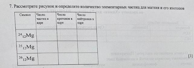 7. Рассмотрите рисунок и определите количество элементарных частиц для магния и его изотопов Символ Число 2412Mg 2512Mg 26 12Mg частиц в ядре Число протонов в ядре Число нейтронов в ядре ming coll Arsen undh