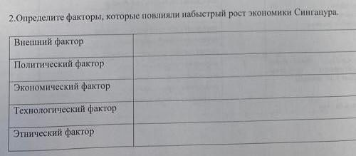 2.Определите факторы, которые повлияли набыстрый рост экономики Сингапура. Внешний фактор, Политический фактор, Экономический фактор ,Технологический фактор, Этнический фактор.СРОЧНО