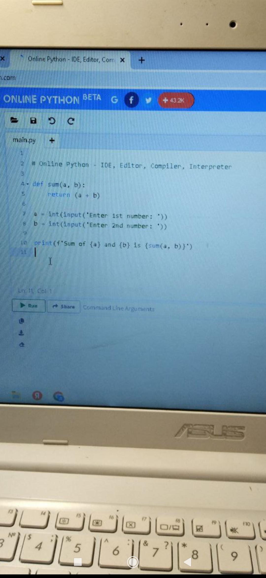 На фотографії код який додає 2 числа. За додавання числ a,b відповідає функція sum.