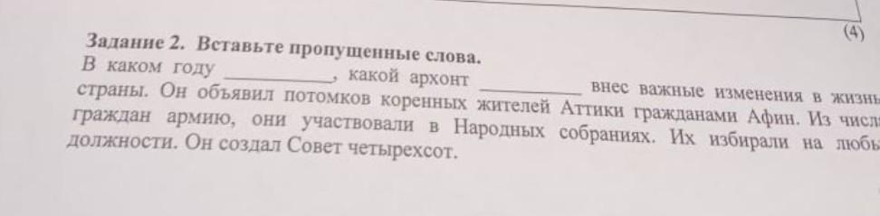 Задание 2. Вставьте пропущенные слова. В каком году какой архонТ внес важные изменения в жизНЬ страны. Он обьявил потомков коренных жителей Аттики гражданами Афин. Из числ граждан армию, они участвовали в Народных собраниях. Их избирали на любь должности. Он создал Совет четырехсот.
